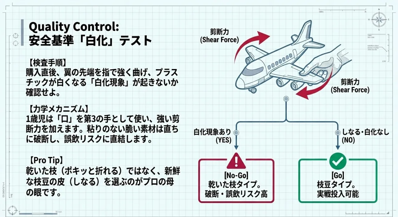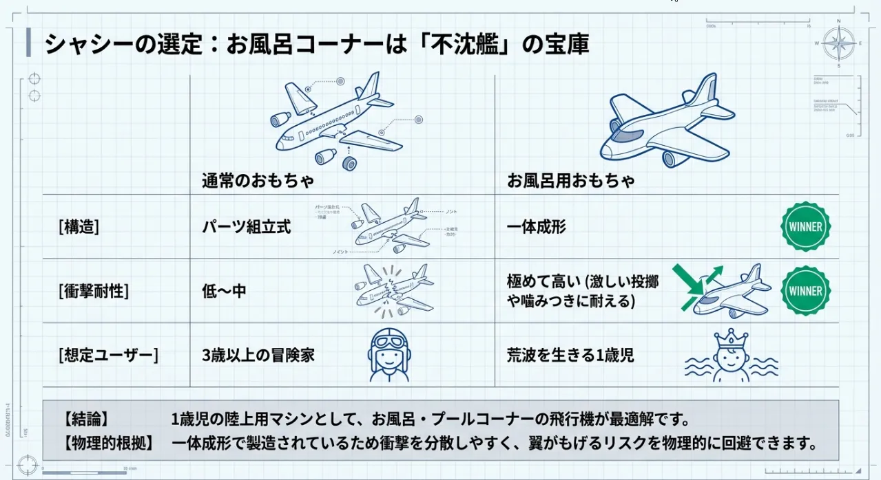 飛行機コーナーではなく「お風呂・プールコーナー」の製品を陸で使用します。一体成形なので衝撃に強く、翼がもげるリスクを物理的に排除。1歳児の激しい投擲や噛みつきにも耐え、指先の安全を守ります。
