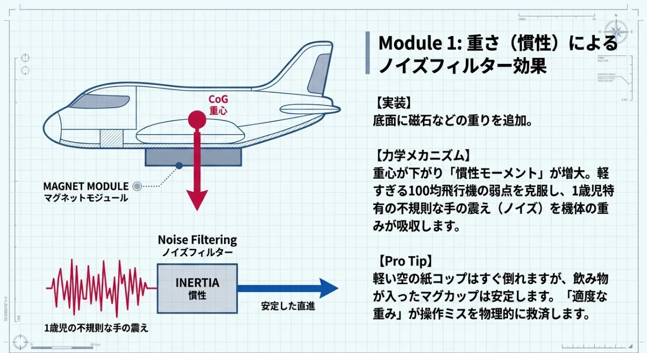 1歳児が飛行機を床で走らせる時、実は下向きに2kgから3kgもの強い力がかかっています。この「押し込み」がおもちゃの走行を邪魔するのですが、ここで重要になるのが「慣性モーメント(おもちゃが転びにくくなる重さの魔法)」です。