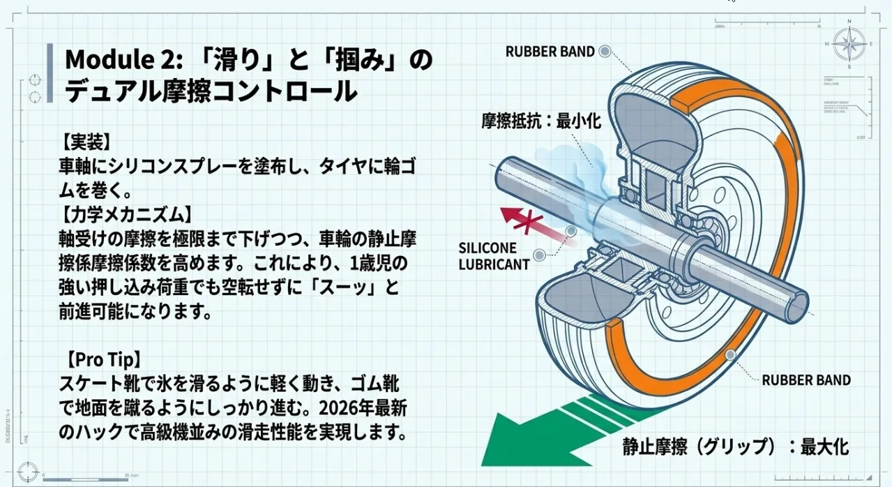 ここで役立つのが、車輪の表面を「エラストマー化(ゴム被覆)」するハックです。車輪に細い輪ゴムを巻く、あるいは内径の合うビニールチューブを薄く切って被せるだけで、床を掴む力(グリップ力)が格段にアップします。物理的に言えば、静止摩擦係数を高めることで、お子さんの手の動きを確実に推進力へ変える仕組みです。