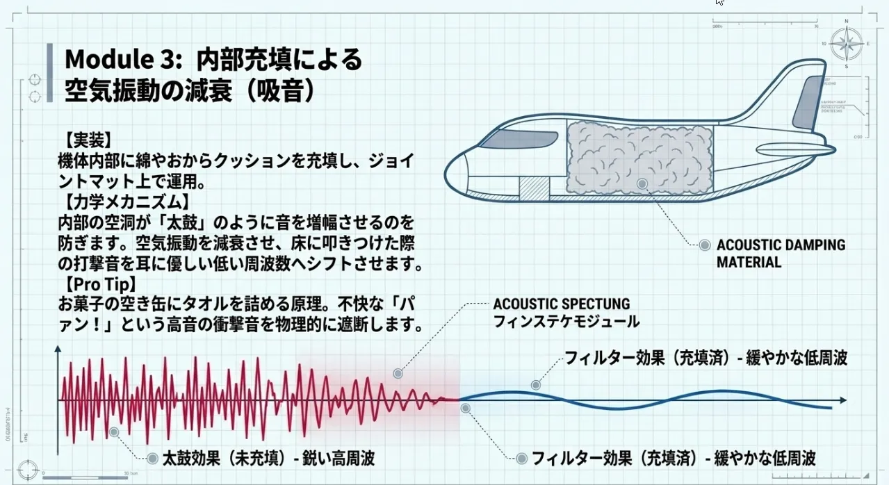 この騒音を抑えるには、内部の空気振動を減衰させるのが一番。機体の隙間から「綿」などを少量詰め込むことで、高い音(高周波)を吸収し、衝撃音を「コンッ」という耳に優しい低い周波数へとシフトさせることができます。また、遊ぶ場所に極厚のマットを敷くことで、衝撃そのものを時間軸で分散させ、物理的な衝突エネルギーを緩和するのも有効な手段です。
