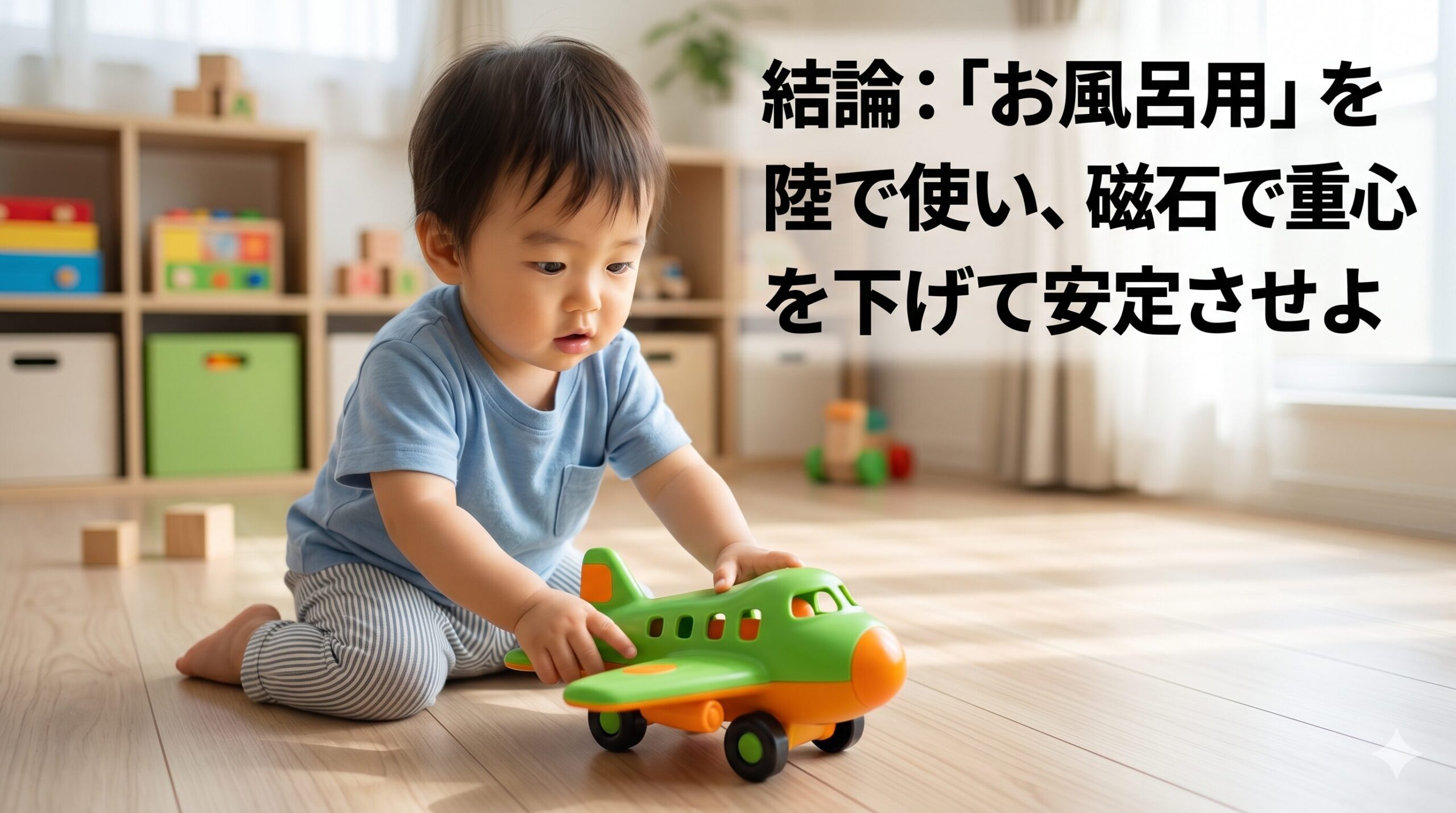 100均の飛行機コーナーにある製品は、1歳児の握力には耐えられません。壊れにくいお風呂用をベースに、物理的な重み(慣性)を加えるのが、安くて最強の解決策です。