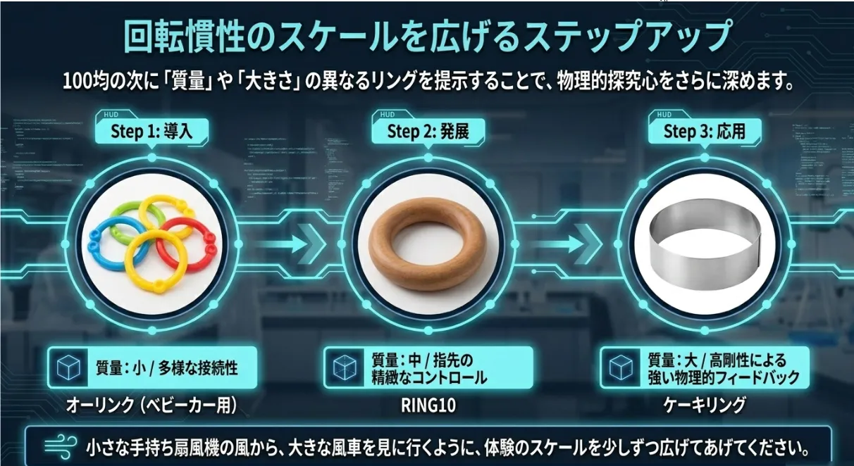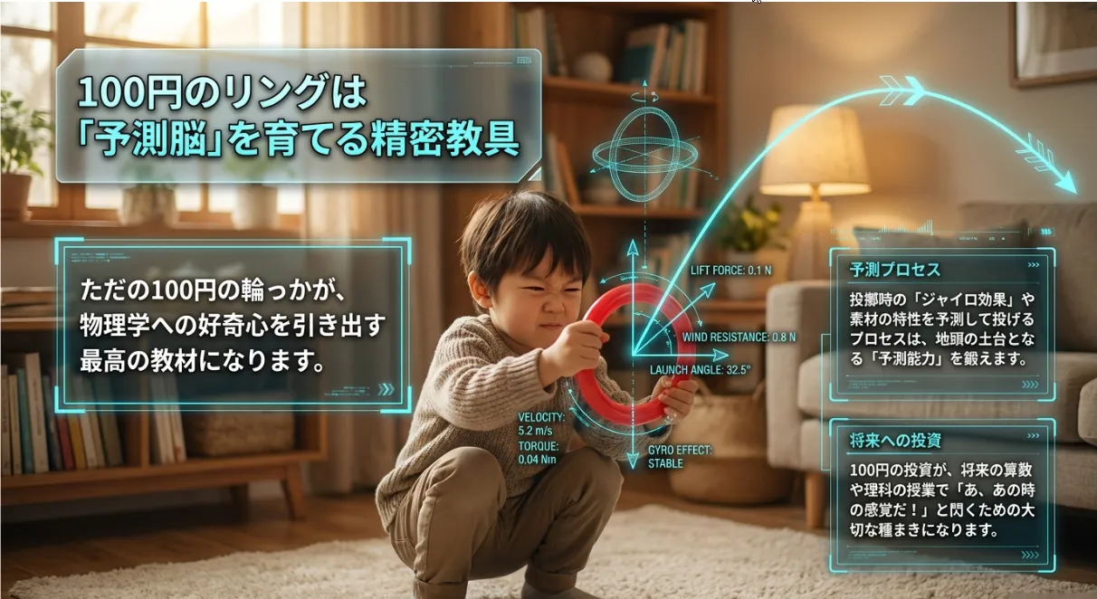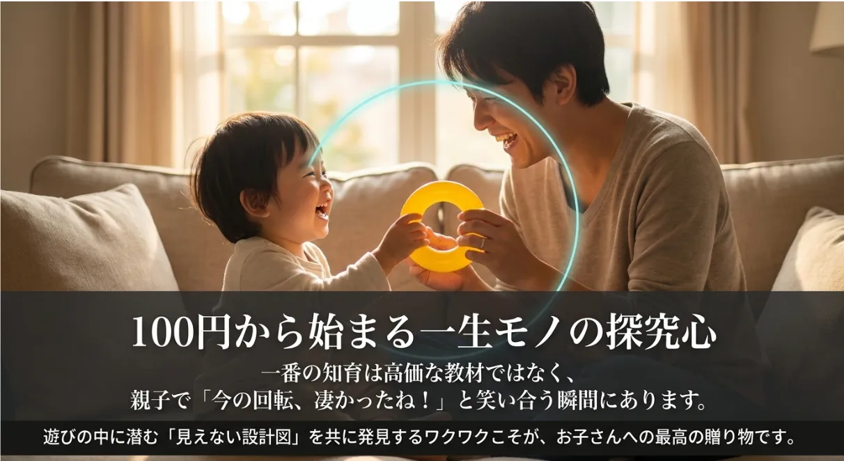 今回お話しした「ジャイロ効果」や「素材の剛性」といった視点を、ぜひ今日のリビングでの遊びに取り入れてみてください。親御さんが「今の回転、綺麗だったね!」「素材で跳ね方が違うね」と工学的な気づきを添えるだけで、100円のリングは世界に一つだけの最高の知育教材に変わります。