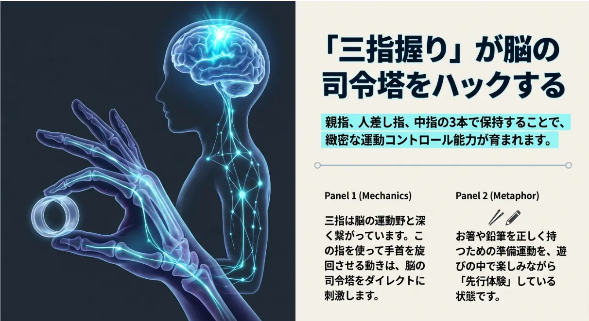 親指・人差し指・中指の3本で保持し、手首を旋回させる動きは、脳の運動指令を司る領域をダイレクトに刺激し、器用さの土台を作ります。