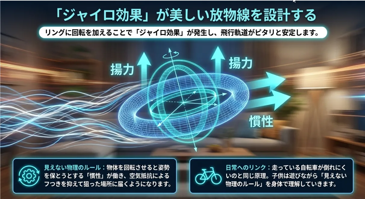100均の輪投げ遊びを「たかがおもちゃ」で終わらせるか、「物理の入り口」にするか。その分かれ道は、投げる瞬間に発生するジャイロ効果への理解にあります。回転をかけたリングは、コマが倒れないのと同じ原理で空中でピタリと安定し、美しい放物線を描きます。
