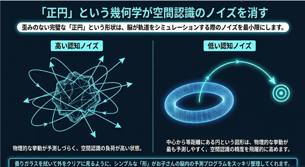 どこから見ても同じ距離という完璧な幾何学形状は、視覚情報のノイズを消し、落ちる場所を正解に導き出す「予測精度」を飛躍的に高めます。