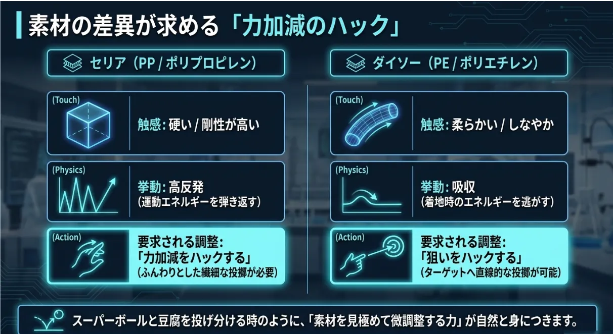PP(ポリプロピレン)は跳ね、PE(ポリエチレン)は止まる。素材による跳ね方の違いを予測し、力加減を微調整する力が地頭の良さに繋がります。