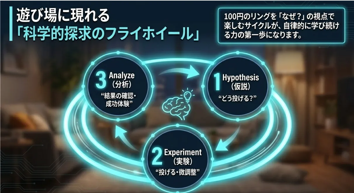 入らなかった時、「もっとよく見て」と言う代わりに、「次はもう少し手首を回してみようか」と具体的な物理のアドバイスをしてみてください。回転(ジャイロ)を加えることで軌道が変わることを体感させると、お子さんは自分で「次はこうしてみよう」と試行錯誤を始めます。この「自ら調整する力(フィードバック制御)」こそが、自律的な学びの第一歩になります。