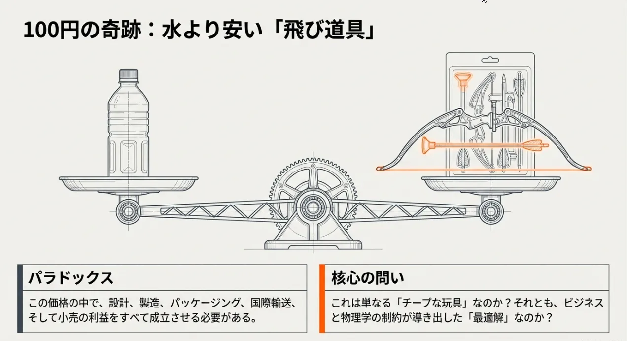 リムの剛性が高いダイソー製をベースにしつつ、弦を低伸縮な「凧糸」に張り替えるのが飛距離最大化の正解。吸着力は界面の密閉ハックで解決できます。