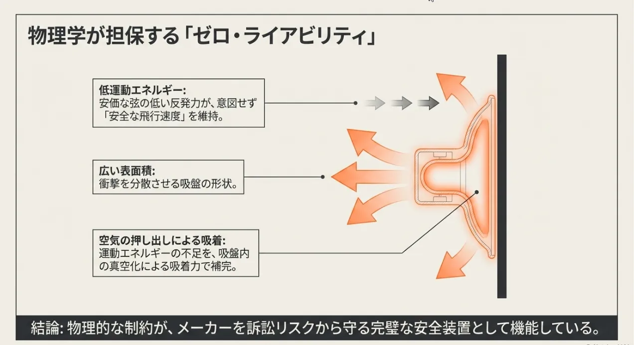 弓矢の威力を物理ハックで高める以上、リスク管理もセットで考える必要があります。矢の運動エネルギー $K = \frac{1}{2}mv^2$ が大きくなれば、衝突時の衝撃力も増大します。特に、先端が吸盤であっても、小さな面積に力が集中すれば眼球などに深刻なダメージを与える可能性があると考えられています。