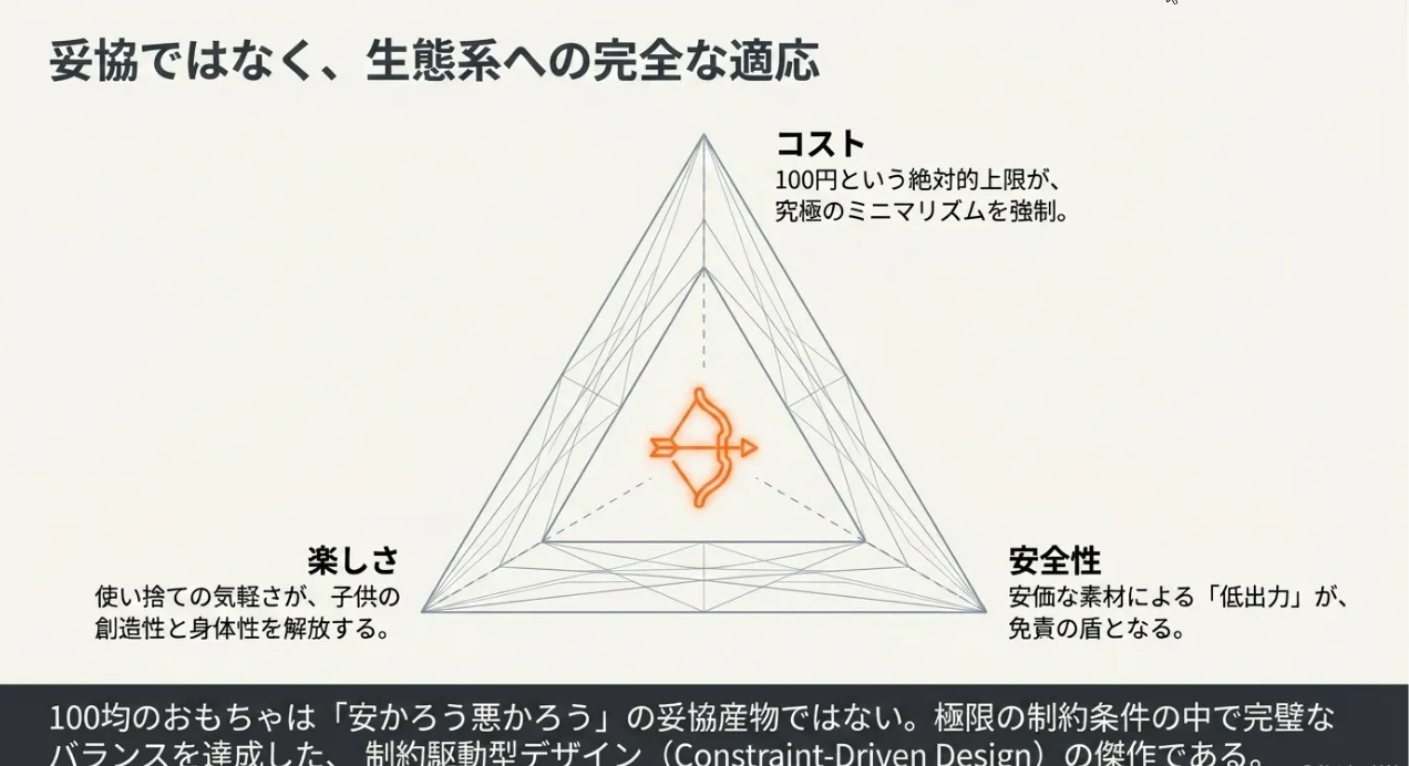 セリアの弓は逆にバネ定数 $k$ を低く抑えることで、子供の力でも最大変位 $x$ を稼げるように設計されています。これは、力の弱い中学生以下のユーザーが使用した際でも、安定した射出性能を得るための工夫と考えられています。