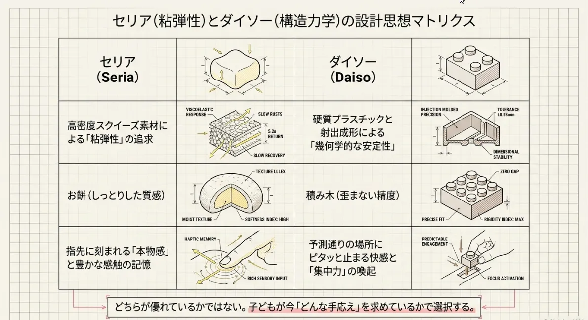 しっとりした粘弾性を楽しむならセリアのスクイーズ、垂直スタッキングの幾何学的安定性を求めるならダイソーのプラスチック製が工学的に合理的です。