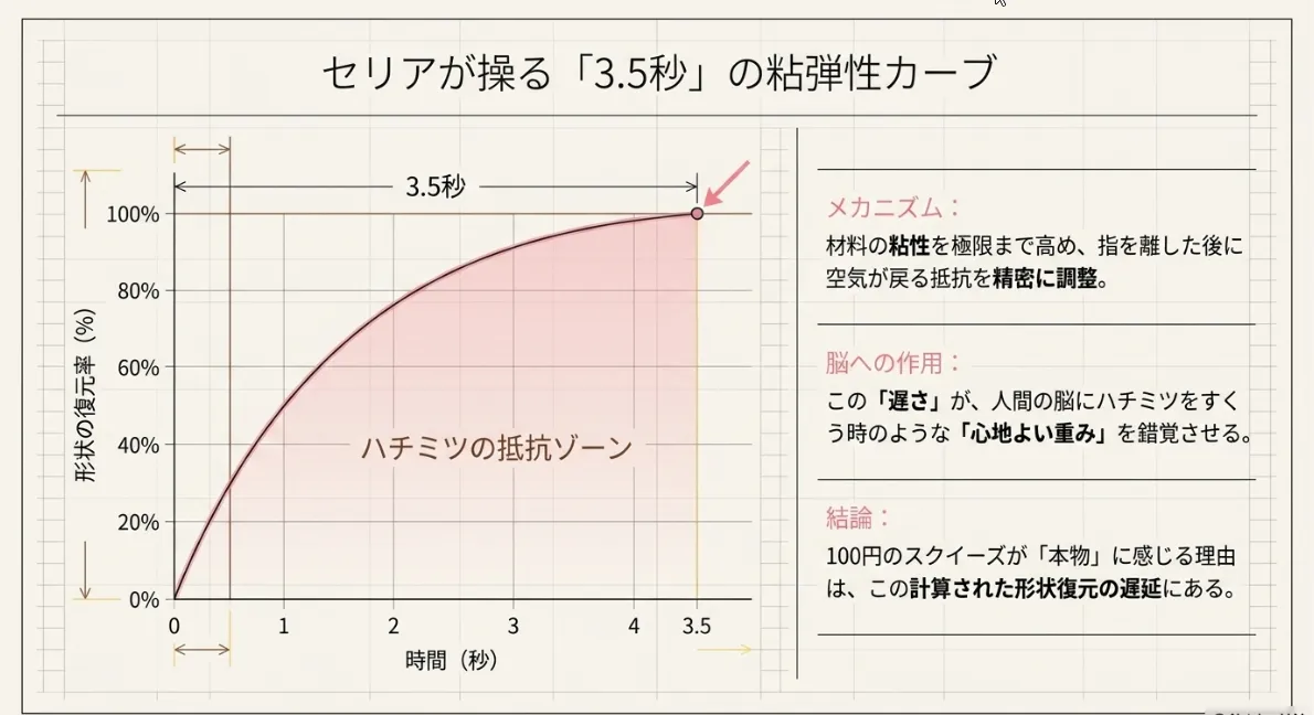 セリアの製品が「しっとりとして本物みたい」と感じられるのは、単なる主観ではありません。材料に含まれる粘性項の比重が高められており、指を離したあとの復元プロセスにおいて内部の空気が排出される際の抵抗(流体粘性)が絶妙に調整されているからです。これは物理学における「標準線形固体モデル」に近い挙動を示しており、数秒かけてゆっくりと元の形に戻る視覚的・触覚的フィードバックが、ユーザーに高い満足度を与えます。