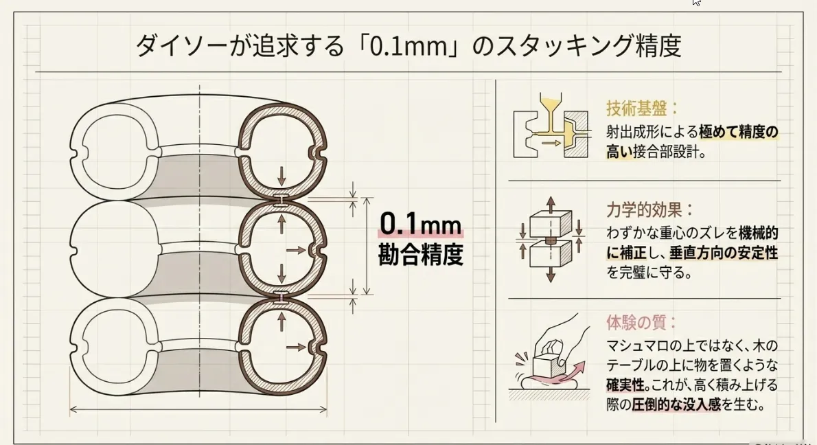一方で、ダイソーのプラスチック製ドーナツは「幾何学的な拘束」によって安定性を担保しています。射出成形による製造過程で、上下のドーナツが噛み合う凹凸部分のクリアランス(隙間)が0.1mm単位で制御されています。この機械的な精度により、積み上げた際の垂直方向へのズレが極めて小さくなり、予測可能なバランスで高層スタッキングを楽しむことが可能です。