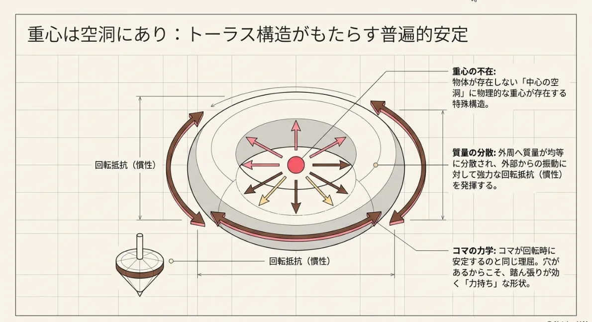 ドーナツの重心は、物質が存在しない「中心の孔」に位置しています。この非局在的な重心配置こそが、垂直に積み上げた際の安定性の鍵となります。外周部に質量が集中しているため、同じ質量の円柱構造と比較して、外部からの振動に対して受ける回転抵抗(慣性モーメント)が大きくなり、転倒しにくいという力学的メリットがあるのです。