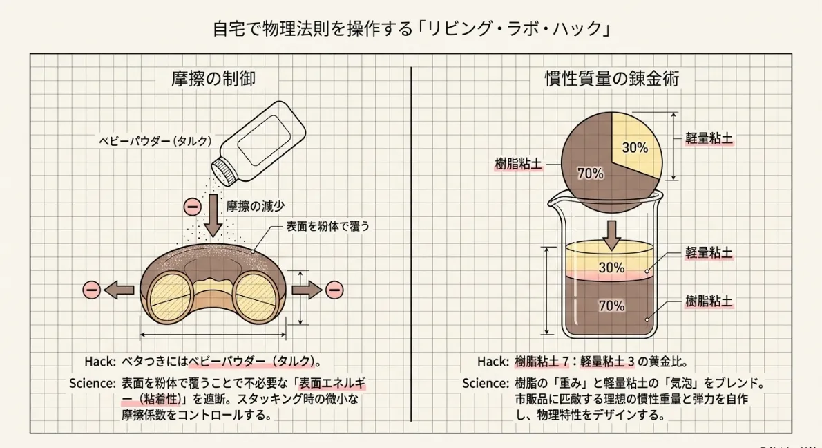 お目当ての製品が店頭で欠品している場合や、既存品の密度に満足できない場合は、100均の粘土を混練して「理想の物理特性」を自作するのも一つの手です。材料力学的に再現性の高い配合比率をご紹介します。