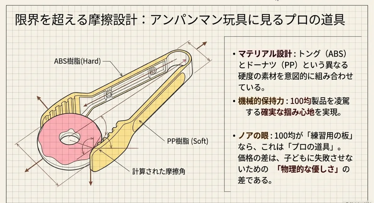 この製品の凄さは、トングとドーナツの接点における「摩擦角」の設計にあります。高剛性なABS樹脂のトングと、適度な弾性を持つポリプロピレン(PP)製のドーナツ。この異なる硬度の組み合わせにより、100均のプラスチック製では滑りやすかった「掴む」という動作において、確実な機械的把持力を担保しているのです。