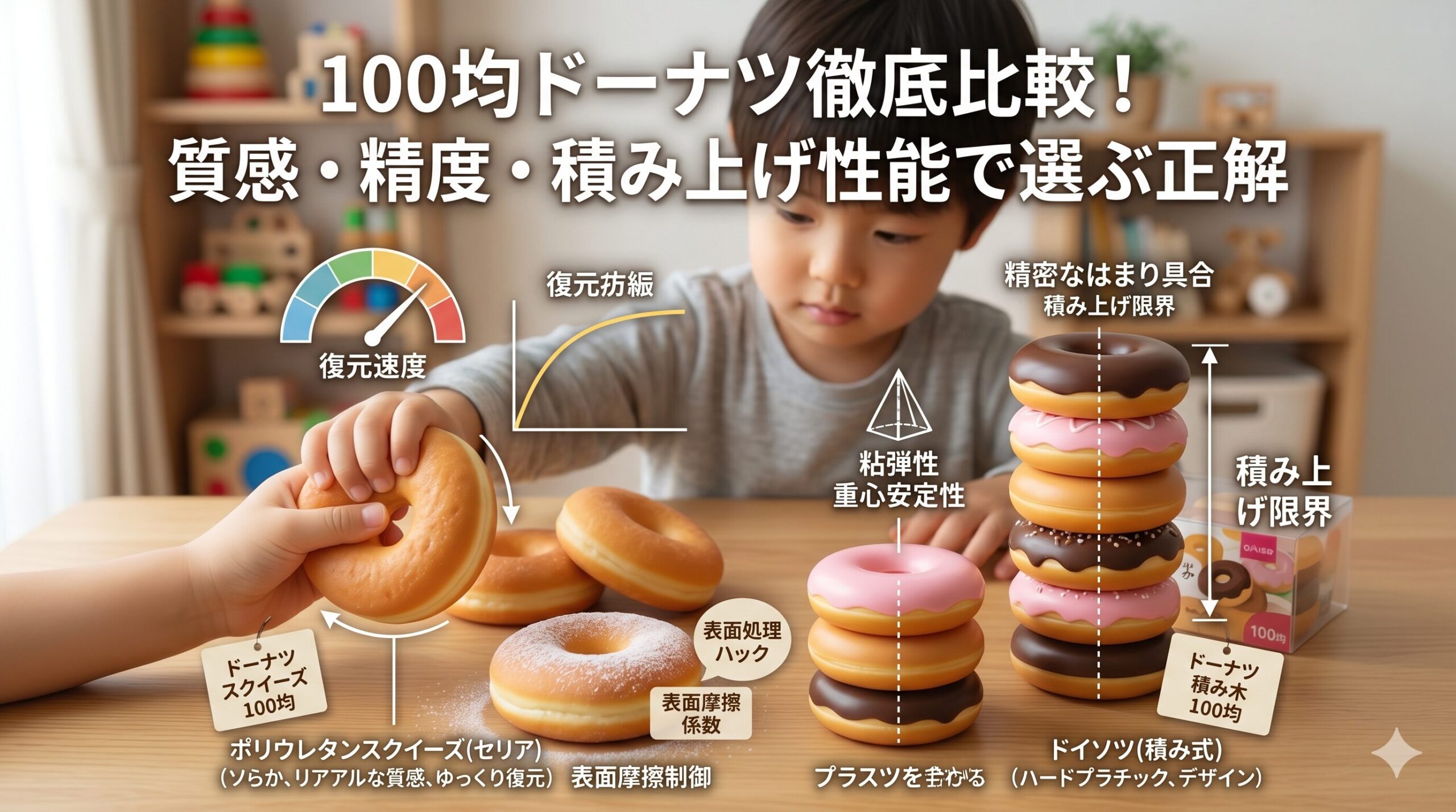 特にセリア(Seria)のスクイーズ製品と、ダイソー(DAISO)のプラスチック製品では、手に持った瞬間に感じる「慣性重量」や、指先に伝わる「反発特性」が全く異なります。今回は、材料工学と構造力学の視点から、これら100均ドーナツ玩具の「物理的な正解」を徹底的に解剖していきましょう。