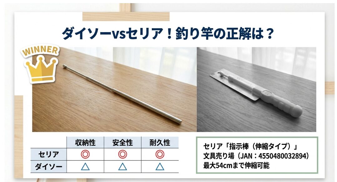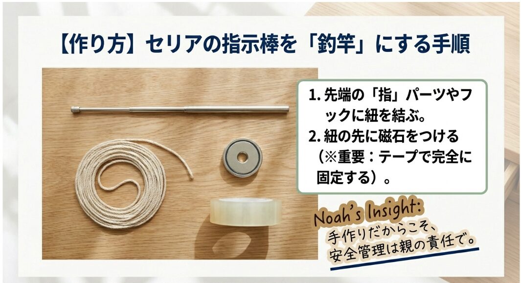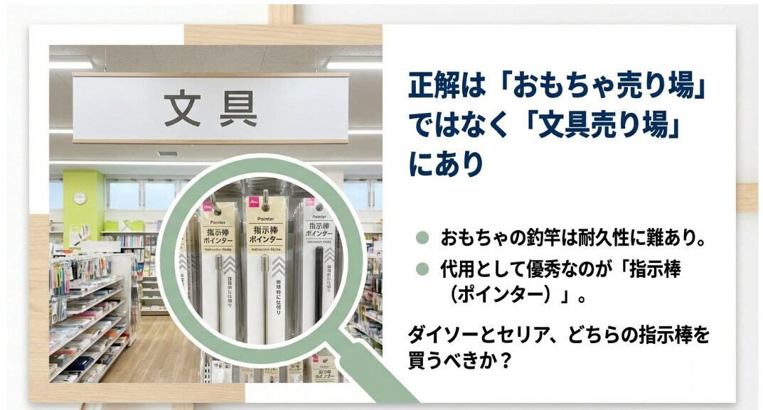 - 竿の代用:文具コーナーの「指示棒」や、園芸用の「支柱(短め)」が持ちやすくて便利です。