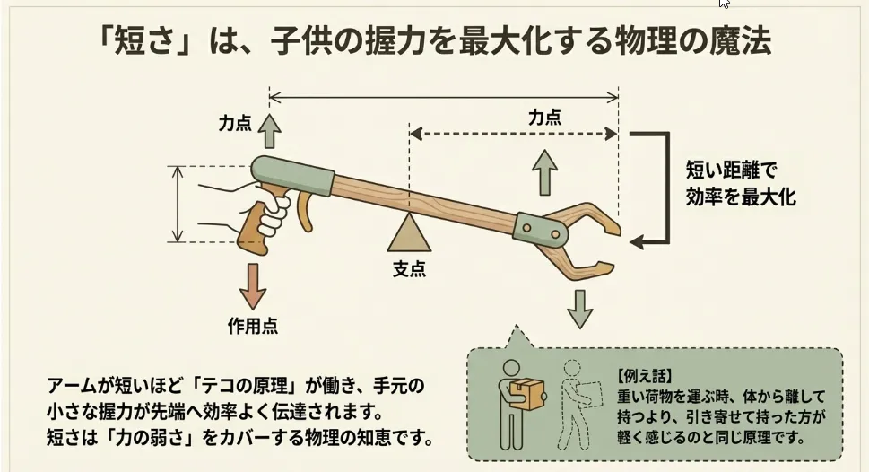 短いほどテコの原理で「つかむ力」がアップし、子供の弱い握力でも確実に物を保持できます。2026年最新の知育術として、操作の成功体験を積み重ねるための最短ルートと言えます。