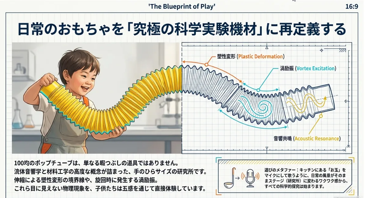 100均の蛇腹ホースおもちゃ(ポップチューブ)は、素材の限界を構造の妙で克服し、目に見えない空気の流れを音へと変換する「トランスデューサー(変換器)」としての卓越性を備えています。