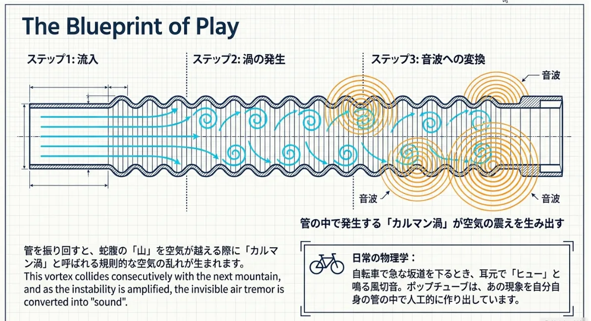 ポップチューブを振り回した際に出る独特の旋回音は、決して魔法ではありません。「衝突せん断層不安定性」と呼ばれる流体力学的な現象に基づいています。通常の滑らかな内壁を持つホースでは決して鳴らない音が、なぜこの「蛇腹」からは生まれるのでしょうか。