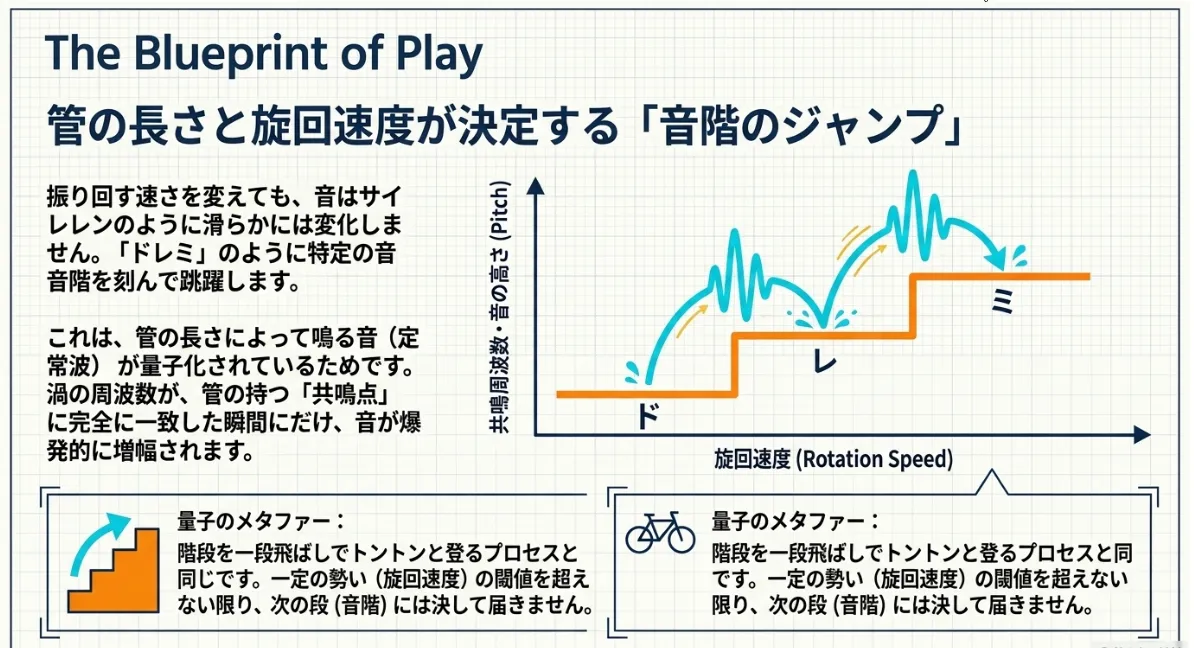 振り回す速度を上げると、管内を通る空気のスピードが増し、渦の放出サイクルが早くなります。その周波数が、管の固有の共鳴点(ドレミのような音階)と一致した瞬間にだけ音が大きく増幅されるのです。物理学的には「定常波の形成」による音の量子化と言えます。