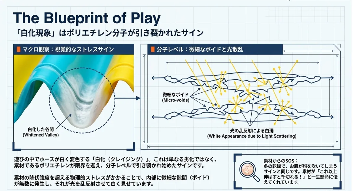 素材であるポリエチレンが降伏強度(耐えられる力のリミット)を超えると、分子鎖が引き裂かれ、内部に「ボイド」と呼ばれるナノレベルの微細な隙間が生まれます。この隙間が光を乱反射させるため、私たちの目には白く見えているのです。