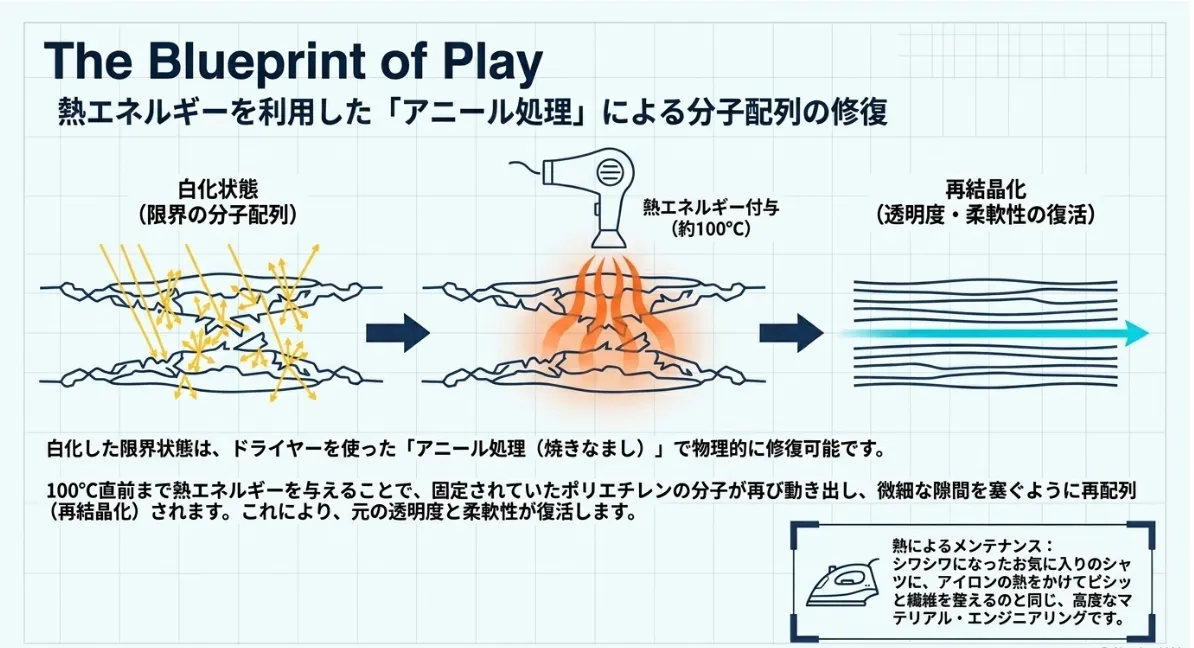 素材の限界を超えて白くなった部分は、分子の並びが乱れた証拠。ドライヤーによる熱運動(アニール処理)で、透明感と靭性を物理的に回復させることが可能です。