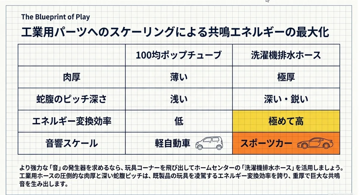 玩具の限界を超えるなら、DIYコーナーの「洗濯機排水ホース」へピボット。素材の硬度と深いピッチが、より攻撃的な音響特性を生み出します。