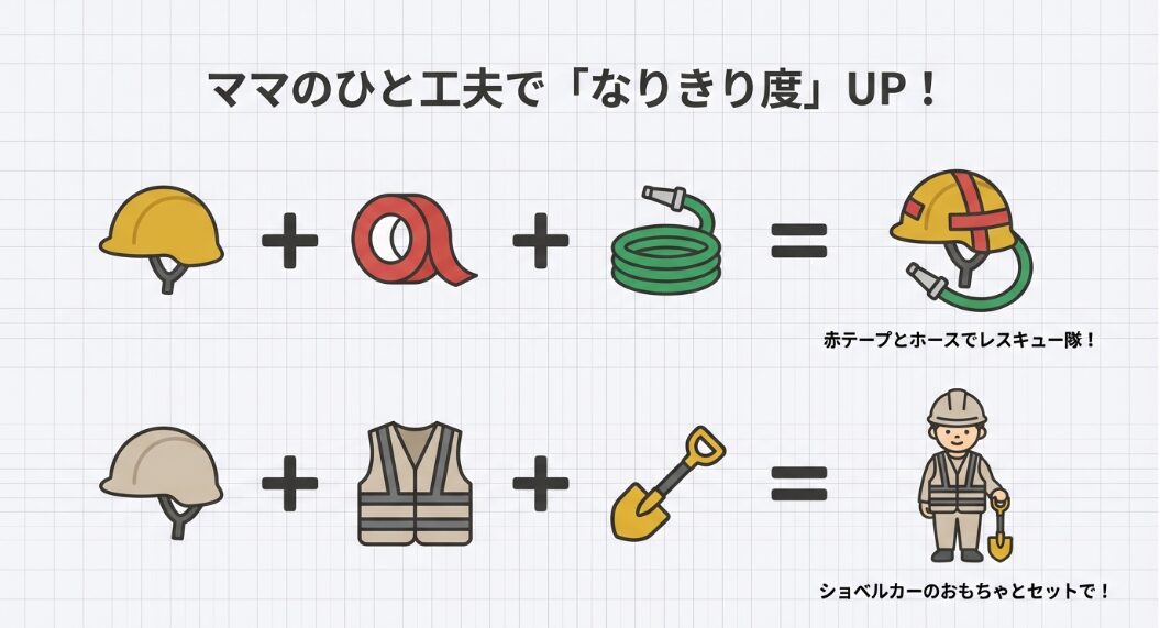 ただのプラスチックの帽子が「勇気のヘルメット」になるのは、ママの温かい声かけと子供の想像力が重なったとき。笑顔が増えるレスキューミッション、今日から開始です!