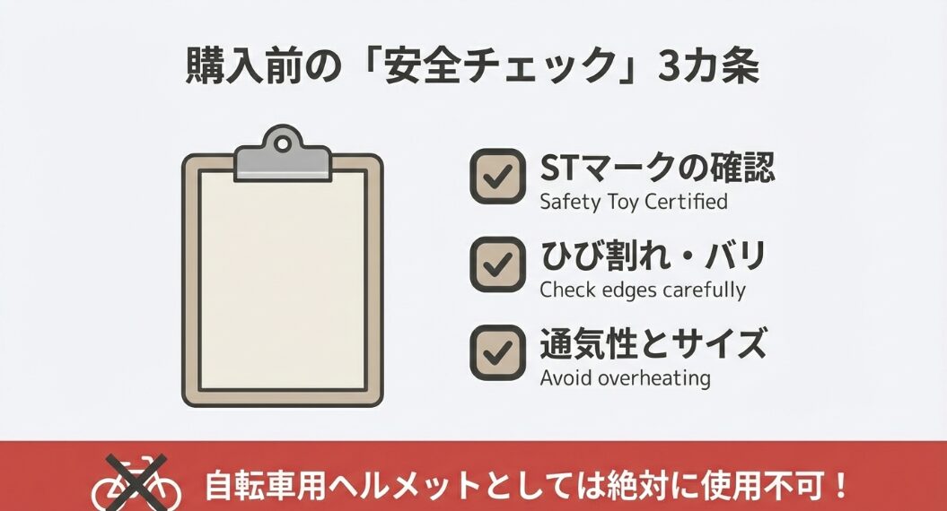 - 安全のお約束:100均特有の「薄いプラスチックの割れ」と「あご紐」の注意点。