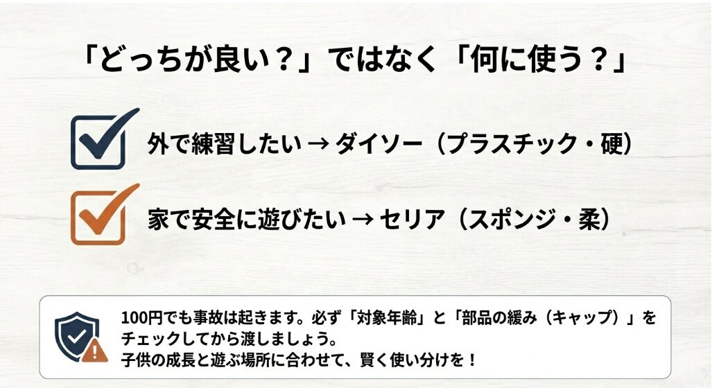 手軽に買える100均アイテムだからこそ、ベテラン母として絶対に伝えておきたいのが「安全の境界線」です。安さの裏にあるリスクを親がしっかり見極めることで、110円の価値はもっと確かなものになります。