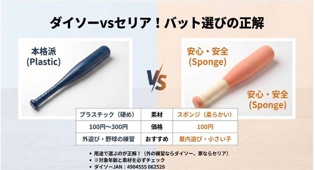 まずは、今の100均にどんな「バット」があるのか、リサーチ結果を一覧にまとめました。実は今、デジタル空間と実際の店舗で、ある「ねじれ現象」が起きているんです。
