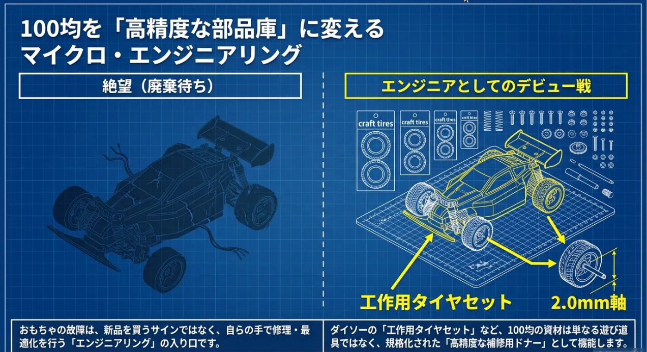 ただし、100均のタイヤを修理に使うには、物理的な「軸径の互換性」や「素材の摩擦力」といったスペックを正しく理解しておく必要があります。目分量で選んでしまうと、「軸が太すぎて入らない」「タイヤが空転して走らない」といった失敗を招く原因になるからです。