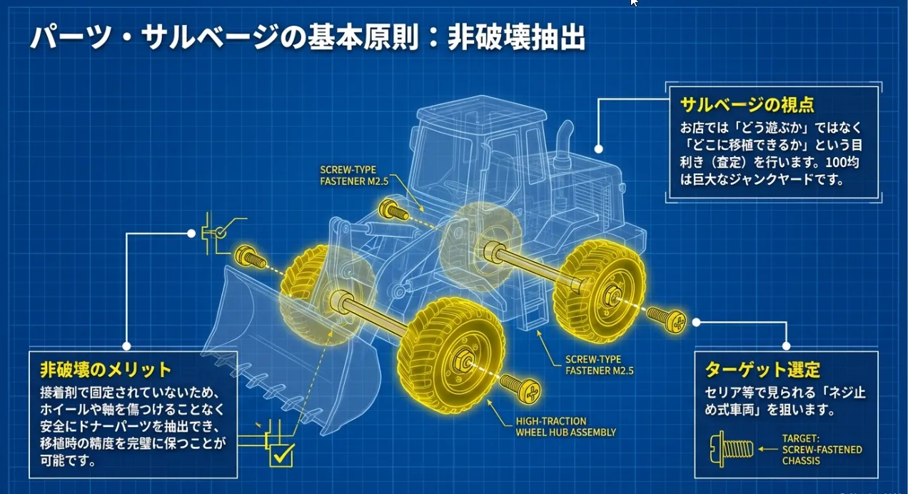 ドナーとして最も優秀なのは、セリアなどの重機・建設車両シリーズに見られる「ネジ止め構造」の玩具です。接着剤でガチガチに固定されたおもちゃは、無理にこじ開けるとホイールや軸受けが歪んでしまいます。対してネジ止め式であれば、精密ドライバー一本で「非破壊」での部品抽出が可能です。