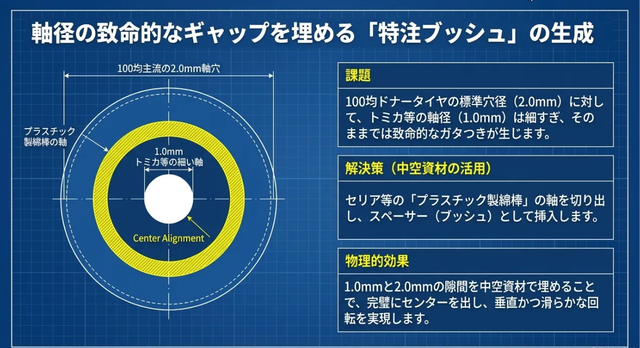ダイソーの工作セットを基準に、1.0mm径のトミカ等へは「ブッシュ(隙間埋め)」加工が必須です。綿棒の軸やストローをスペーサーとして活用することで、異径シャフトでも真円に近い回転を確保できます。