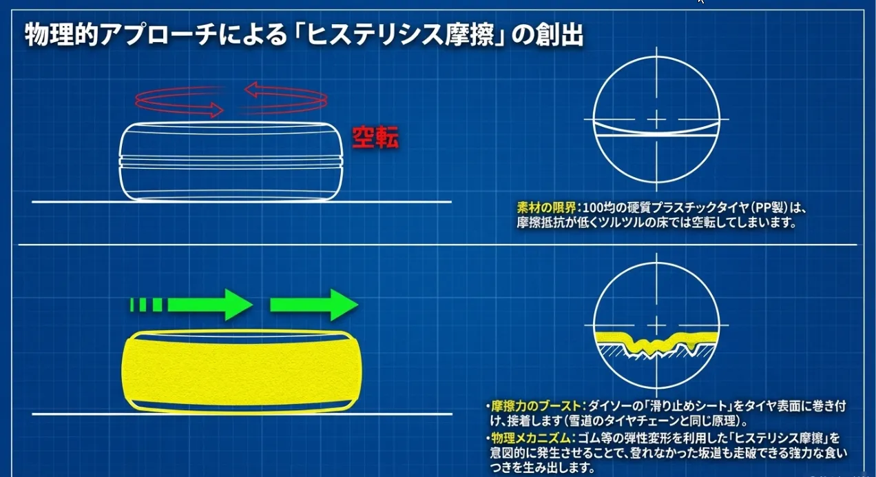 滑りやすい硬質プラスチックタイヤは、表面に「滑り止めシート」を貼ることで、路面とのヒステリシス摩擦を物理的に高められます。これにより、空転を防ぎ登坂能力を劇的に向上させることが可能です。