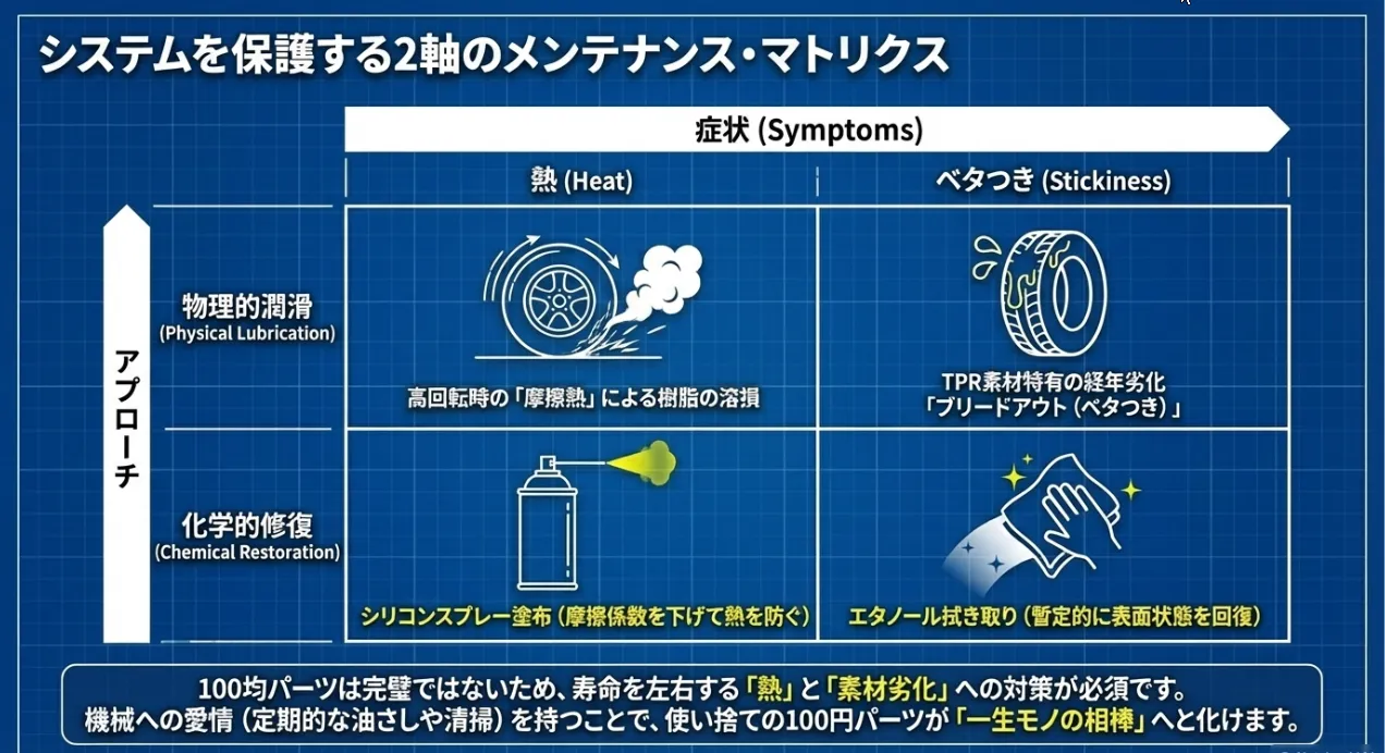 100均のタイヤ軸受けは、多くの場合プラスチックが直接金属軸に触れる構造です。ここで発生する摩擦熱 $Q = \mu N v$ が樹脂の熱変形温度を超えると、軸受けが楕円形に溶け、タイヤが脱落する原因となります。これを防ぐ唯一の方法は、潤滑剤によって摩擦係数 $\mu$ を極限まで下げることです。