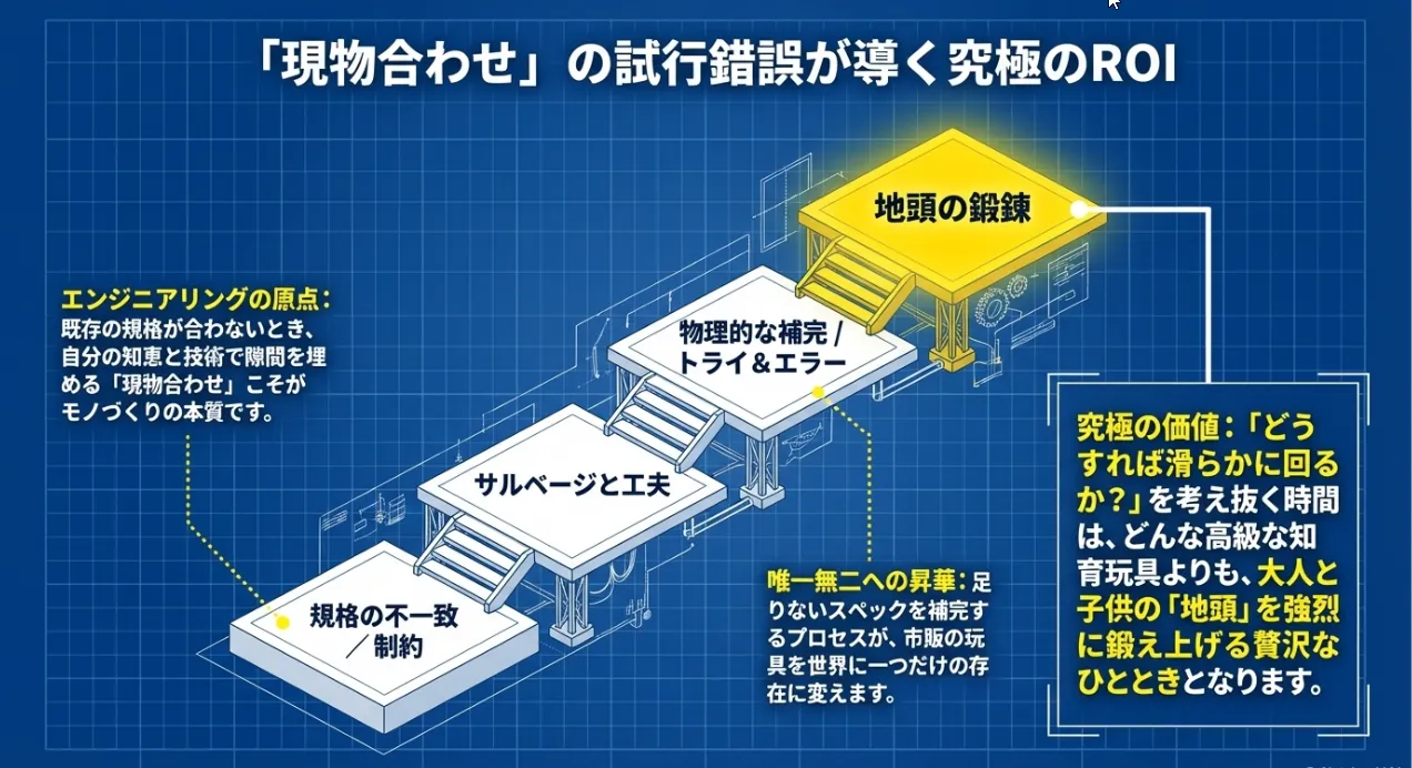 100均のタイヤおもちゃは、そのまま遊ぶだけでは見えない「物理資材としての可能性」に満ちています。規格が合わなければスペーサーを自作し、滑るなら表面を加工する。この「現物合わせ」の試行錯誤こそが、単なる修理を超えた最高の工作体験になります。