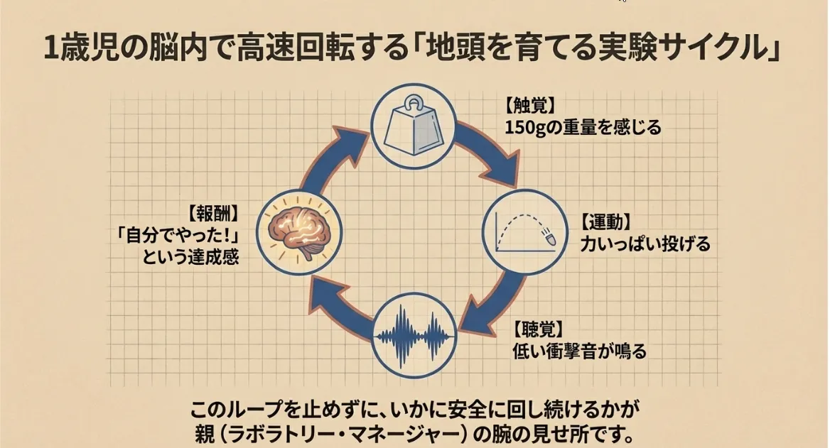 物理学の法則($F = ma$)にある通り、物体を投げた時の衝撃力は質量に比例します。お子さんは、投げた時の手にかかる抵抗や、床に当たった時のズッシリとした感覚を無意識に学習しています。この感覚的な納得感が、集中力を維持する鍵になります。2026年の知育設計においても、この「触覚と重量のリアリティ」は、子供の満足度を左右する決定的な要素とされています。