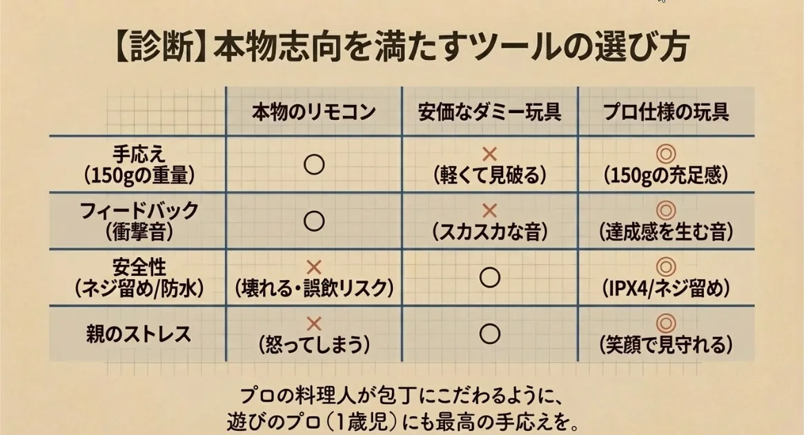 | お子さんの反応 | 「本物」として集中して遊ぶ | すぐにポイッと投げ捨てる |