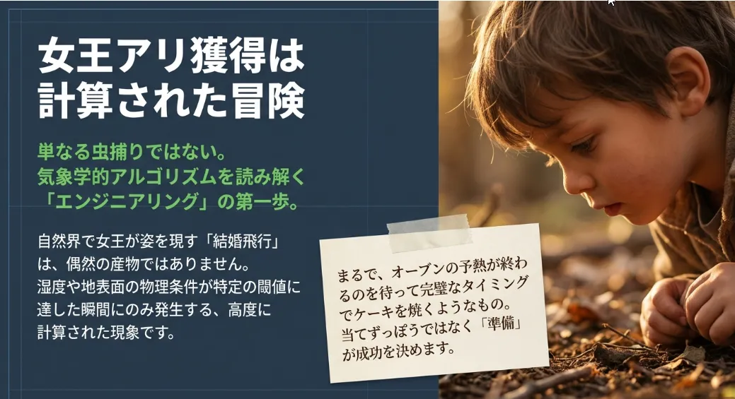 でも、闇雲に地面を探しても女王アリには出会えません。実は、彼女たちが空へ飛び立ち、新しい家族を作る場所を探し始める「結婚飛行」には、解き明かされるべき厳密な気象学的アルゴリズムが存在するのです。2026年の今、私たちは気象データをハックすることで、運任せではない「確実な獲得」を実現できます。一匹の女王から数万の意思が統合された「超個体」が生まれる瞬間を、あなたもお子さんと一緒に目撃してみませんか?