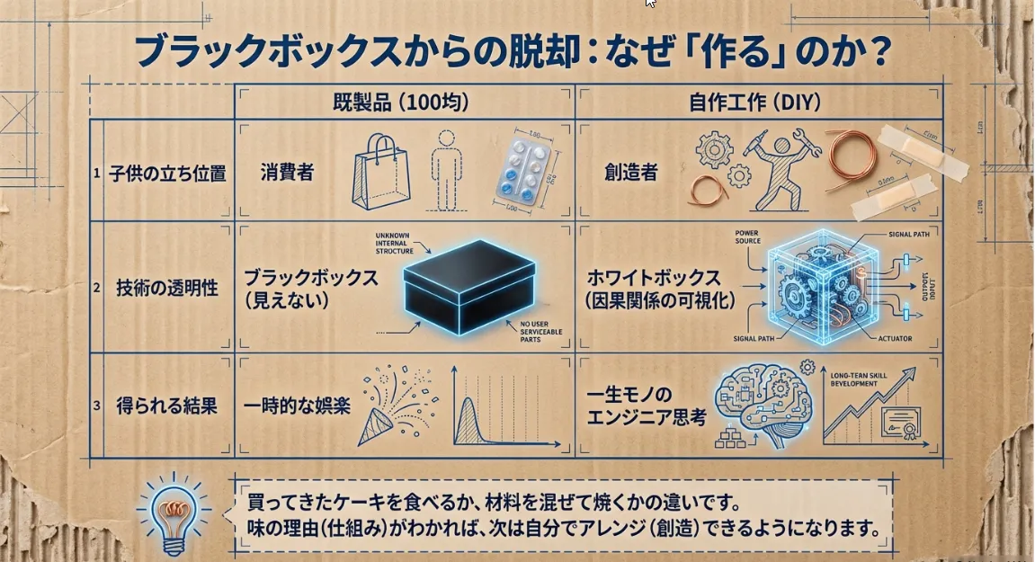 最近の100均おもちゃは本当に凄いです。でも、子供がボタンを押して音が鳴るだけの遊びを繰り返しているとき、その脳内では「ボタン=音が鳴る魔法の箱」という認識で止まってしまっているかもしれません。自作工作の最大のメリットは、その魔法を「工学的な理屈」に翻訳してあげられることです。