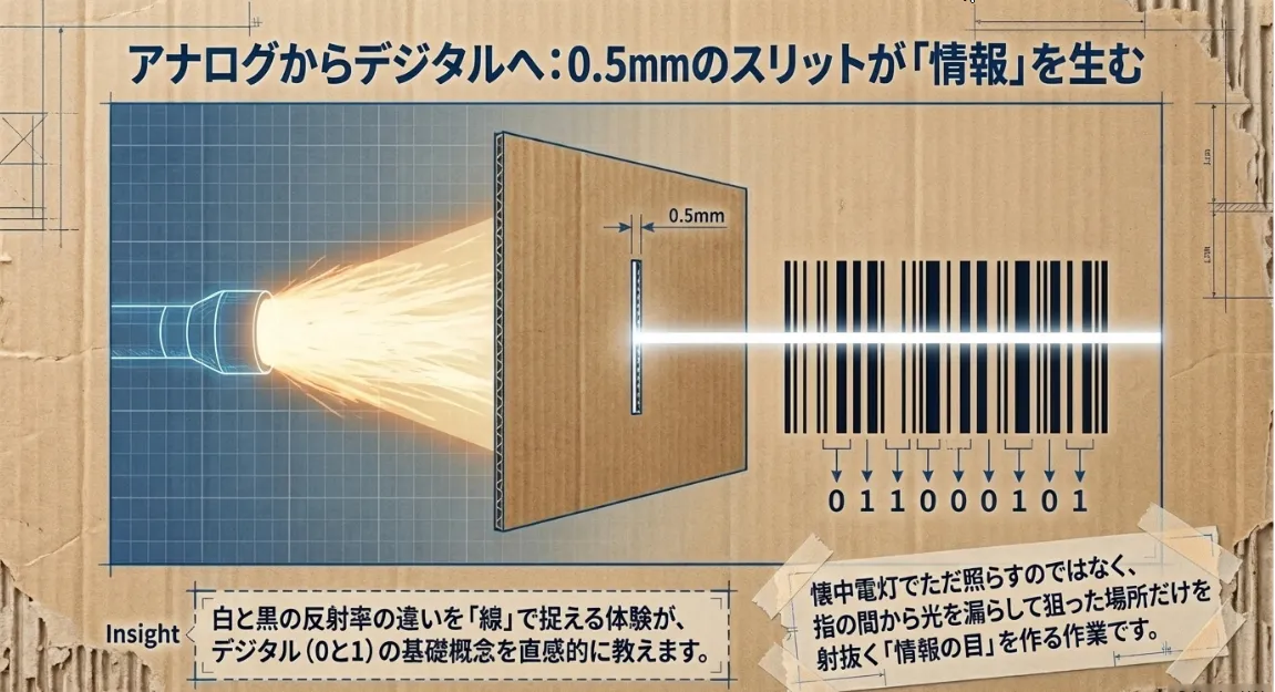 実際のバーコードリーダーは、白い部分의反射と黒い部分の吸収をセンサーで読み取っています。工作の途中で、子供と一緒に「白い紙」と「黒い布」をLEDで照らして、眩しさの違いを観察してみてください。「黒いところは光を吸い込んじゃうね」という気づきは、アナログな光が「0か1か」のデジタルデータに変換される際の「しきい値」という、高度な概念を直感的に理解するヒントになります。