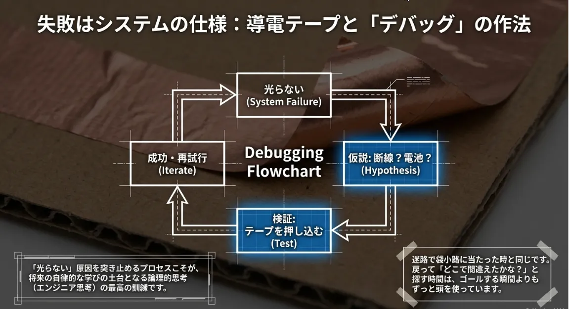 自作スイッチでよくあるのが、銅箔テープの粘着面が電気を通さないタイプだった場合に起こる接触不良です。テープを折り返して表面同士を接触させるなど、小さな工夫で解決できます。目に見えない電気の流れを想像し、「こうすれば流れるはずだ」と仮説を立てて試す。この繰り返しこそが、まさにエンジニアリングの第一歩です。2026年の学びは、答えを教わるのではなく、答えへの道筋を自分で作るスタイルが主流になっています。
