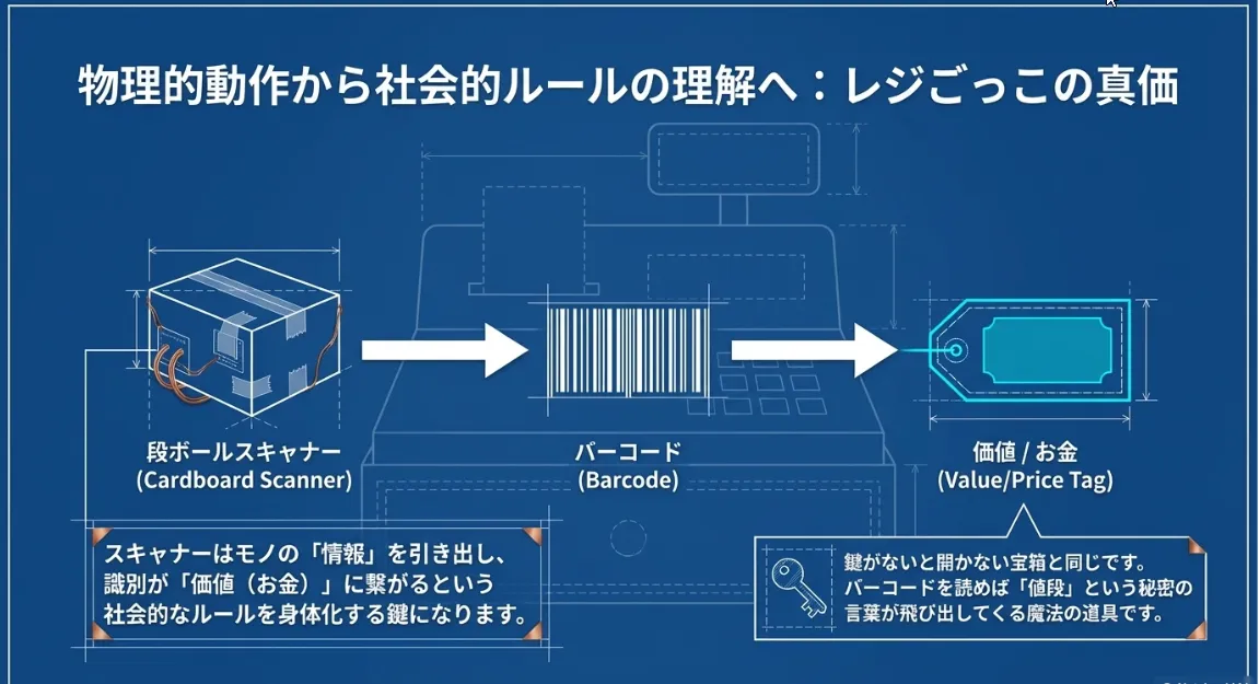 スキャナーが出来上がったら、家中のものに自作のバーコードを貼って「お店屋さんごっこ」を始めてみましょう。子供にとってスキャナーは、ただ光る棒ではなく、モノの「名前」や「値段」という目に見えない情報を引き出す「魔法の鍵」になります。この象徴遊びを通じて、モノには固有の識別情報があること、そしてそれが社会の仕組み(お買い物)に繋がっていることを身体で学んでいくのです。