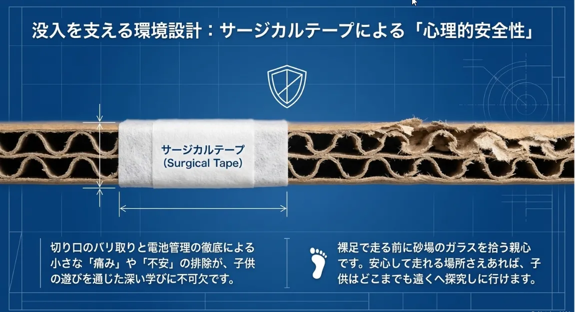 道具選びで妥協しないことが、工作の「本物感」を左右します。特に3Mのテープは、バリ保護だけでなく、スイッチのテクスチャ調整にも使えるので、わが家の工作箱には常にストックしてあります。怪我を恐れて工作を遠ざけるのではなく、正しい道具で安全に楽しむ姿勢を背中で見せてあげたいですね。