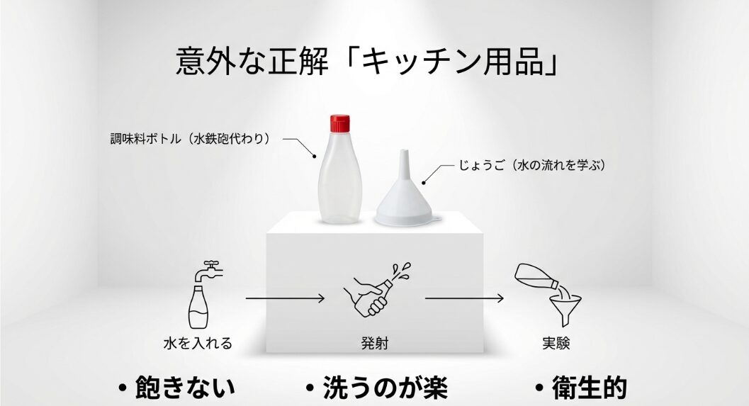 「お風呂 おもちゃ 100均」が見つからない時、私が真っ先に向かうのはキッチンコーナーです。ザル、お玉、ドレッシングボトル、漏斗(じょうご)。これらは子供にとって、立派な知育玩具になります。