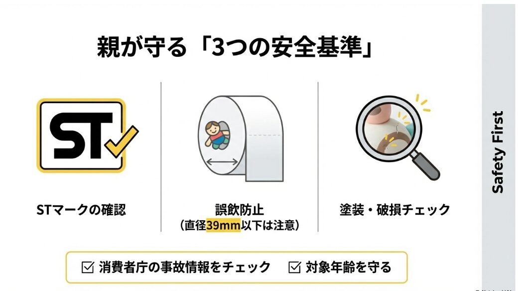 - 誤飲対策:STマーク(玩具安全基準)がない製品も多いため、3歳未満のお子様、特に「何でも口に入れる時期」の子には絶対に与えないでください。