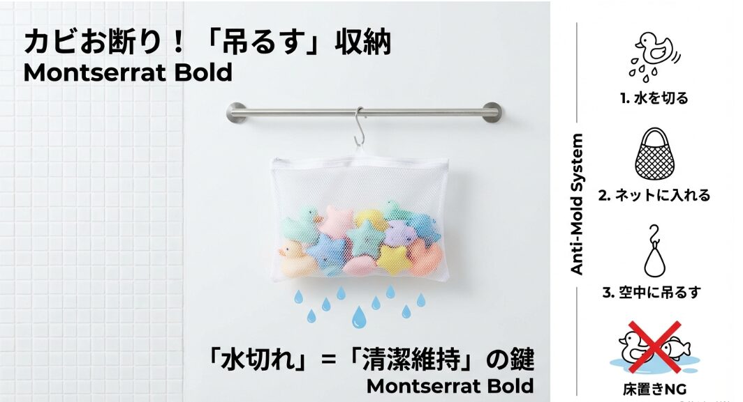 - 素材の劣化:浴室収納のために100均の園芸用フック(鉄製)を流用すると、数週間で「もらいサビ」が浴槽に沈着し、取れなくなります。